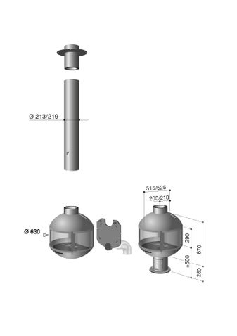 Kavisli ısıya dayanıklı geniş pencereler ateşi 180 derecelik açıyla seyretmenizi sağlar.63 cm çaplı cor-ten çelikten 2.5 mm kalınlıkta ağırlık 42 kg.Baca boruları 273 mm lik çapa sahip.Görünür düşey baca borusu ve arka duman çıkışı seçenekleri bulunmaktadır.Şömine açılır veya kapanır kapı ve bütünleşmiş sıcak-hava reküperatörü ile çalışmaktadır. Baca borusunun uzunluğu ve diğer adaptasyonlar ihtiyaçlara göre üretilmiştir.